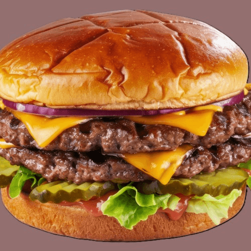 Bun potato sliced - add butter. 100 island, pickles, 2 half strips bacon, lettuce, tomato, onions, single or double burger patty, processed cheddar cheese