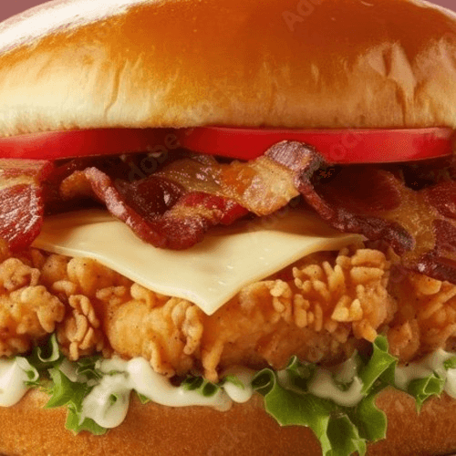 Bun kaiser yellow corn, add butter, honey mustard, half strips bacon, American cheese, single or double crispy chicken, lettuce tomato