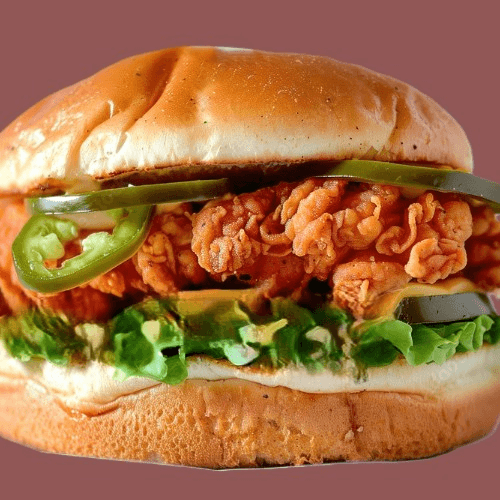 Bun kaiser - add butter, peppercorn ranch, pepper jack cheese, single or double spicy chicken, lettuce, tomato, pickles