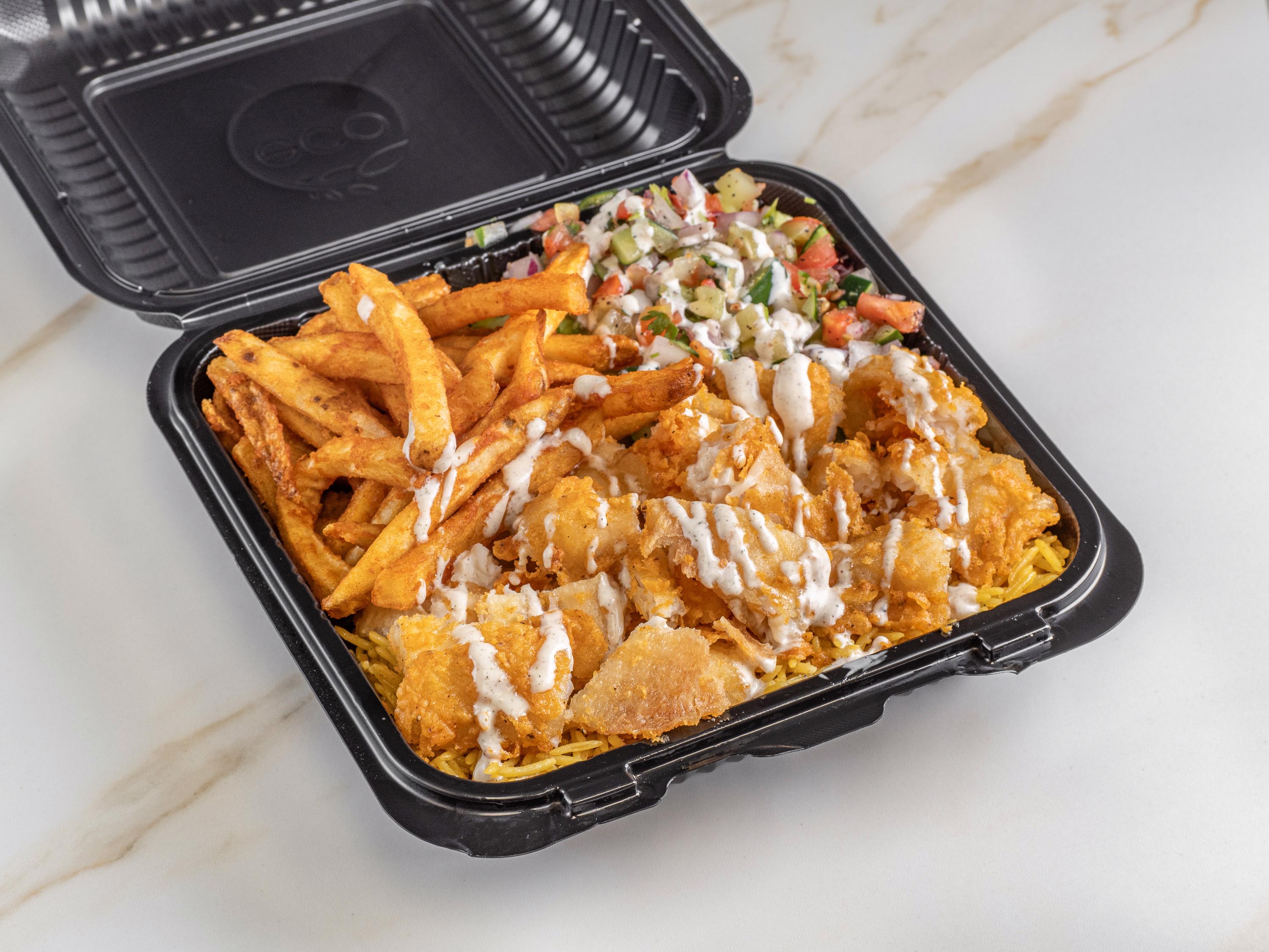 Lamb over fries is a mouthwatering dish that combines succulent slices of seasoned and roasted lamb with crisp, golden fries. This delightful fusion offers a savory experience, as the tender lamb and crispy fries come together, creating a satisfying blend of textures and flavors. It's a hearty and flavorful option for those craving a delicious and fulfilling meal.
