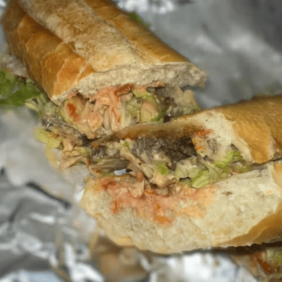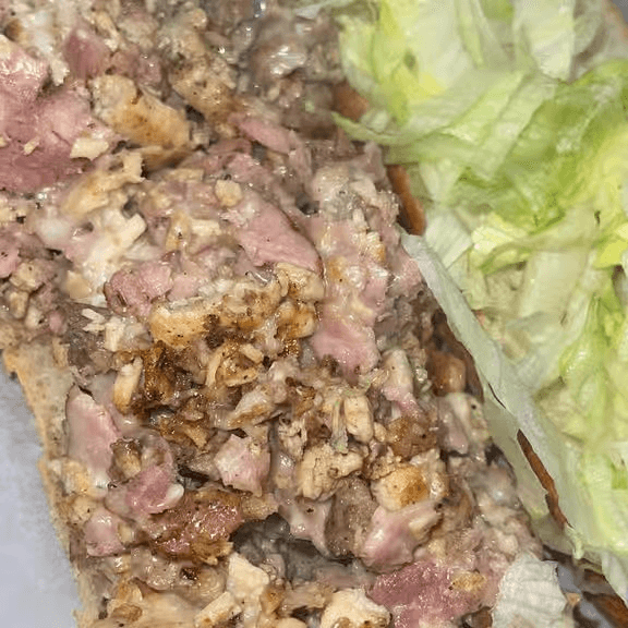 Chicken or beef, with ham american cheese, lettuce, tomatoes, mayonnaise, and ketchup