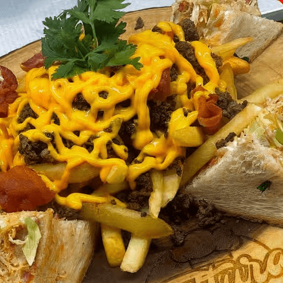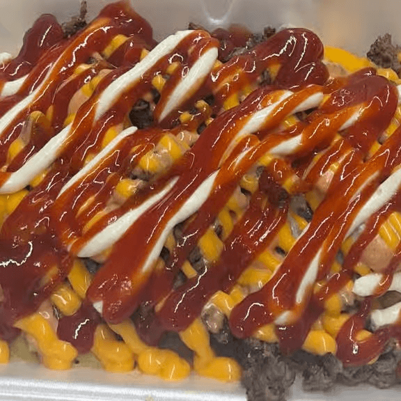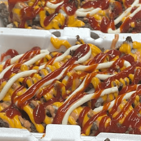 With cooked shredded cabbage, ground meat, corn, potato stix, mayokechu and cheese whiz